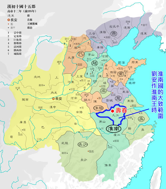 及至漢武帝的時候,表面上還有不少封國,但面積越分越小,比方我上文一直提到的淮南王劉安(他是劉邦的孫子,漢武帝劉徹的叔叔,以壽春為都城),他作淮南王時的「淮南國」只有漢初時的面積的四分一左右,即上圖用藍線圈上的部分。