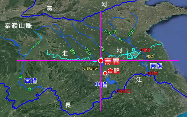 古代中國陸上交通不發達,無論是北方南征或南方北伐,調動軍馬糧草,都必定得通過縱(南北)向的幾條主要河道。西路可通過漢水,但這條路較遙遠,且被秦嶺隔斷,不是首選;東路可通過邗溝等河道,但是河道淺窄,經常淤塞,不利大型兵船運行;最佳之選是中路,通過濡須水、巢湖與巢肥運河,而匯通南北甚至東西水道的關節點,即在十字正中央的,毫無疑問,就是壽春!