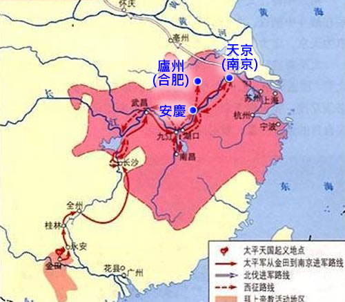 以上是太平軍「全盛時期」的版圖,以天京(南京)為都,勢力遍及今天江西、湖北、安徽、江蘇及浙江各省,甚至包圍上海,連洋人都害怕起來。觀上圖便知,安徽居中,尤其當時的安徽省省會安慶,握守長江咽喉,是守護天京的門戶,故雙方在此爭持得最為激烈甚至慘烈。(可參看維基《安慶之戰》,此不詳述。)