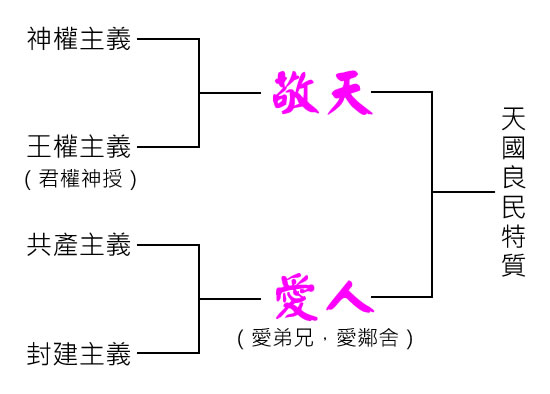 基督信仰的本質是「政治」,但不是「口稱天國心戀西國」的政治,而是「身在人間心慕天國」的政治。因此基督徒的使命不是意圖以任何方式改變這世界的政局與政體,他們只是盼望——盼望終有一天,「天國」——跟這現有世界的完全不同的政局與政體會「忽然」出現。那「新政局」是天下太平萬國一統,那「新政體」是神權主義、王權主義、封建主義與共產主義的完美實現。