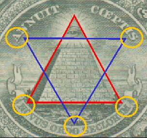 ¦b¤@¤¸¬ü¶r¤Wªº°êâ¹Ï¶H¤W·tÂáu¤»¨¤¬P§Î¡v¡]¨ä¹ê¬O¥Ñ¨âӬۤϤè¦Vªº¤T¨¤§Î²Õ¦¨¡^¡A¦Ó°£¤F¡u¥þª¾ªº²´¡vªº³»ÂI¥~¡A¨ä¾l¤Ó³»ÂI«ü¦Vªº¤Ó¦r¥À¡A¤À§O¬°¡]¥Ñ¥ª¤W¶}©l¡^¡G¢Ï¡B¢á¡B¢Û¡B¢Ý¡B¢Ü¡A¡uè¦n¡v¥i¥H¨Ö¦¨¡G
